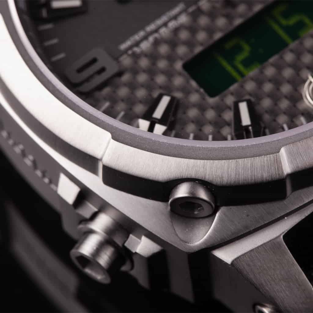 شاشة العرض الرقمية: AM/PM ساعة، دقيقة، ثانية التاريخ: شهر/يوم او يوم/شهر بالإضافة إلى منبه وساعة توقيت الكرونوغراف، بوصلة رقمية، منبه مستوى شحن البطارية وتوقيت 58 عاصمة. المنبه: 5 أوقات أو تنبيه مبرمج