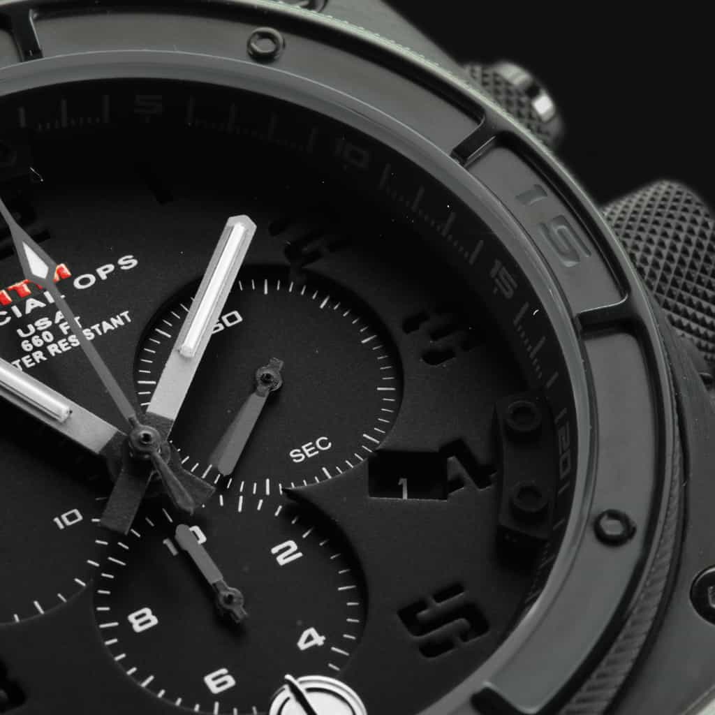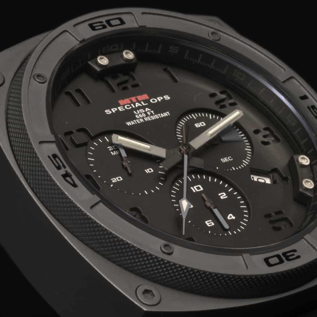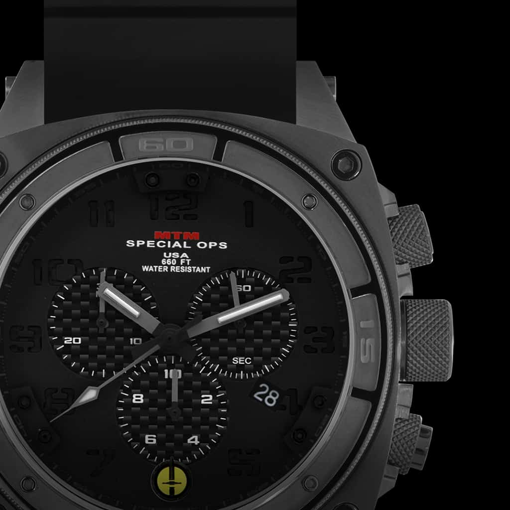 MTM Special Ops Black Predator II watch can withstand service under the most extreme conditions. Its three dial chronograph measures down to one tenth of a second, which is illuminated with tritium glowing hands. A solid 316L stainless steel or titanium watch case and/or band ensures its strength and resilience for years of use. The locking screw-down crown protects it from water damage to help its depth protection of up to 200 meters/660 feet.